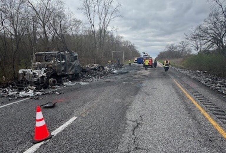 According to the ISP report, when the vehicle stopped, the driver noticed the brakes on one side of the tractor were glowing red and started on fire. The driver attempted to put out the fire with a fire extinguisher from her cab; however, the fire had already spread to the vehicle. Authorities say the fire quickly spread to the trailer and consumed the cab and trailer. The cargo, paint cans, ignited and caused an intense fire that quickly spread to the adjacent trees and even caught the asphalt roadway surface on fire. The driver of the semi was not injured.