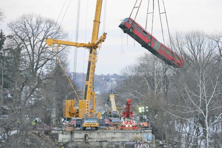 When the Forbes Avenue bridge gave way, it sent a city bus and four passenger cars down some 100 feet (30 meters) to a ravine carved by Fern Hollow Creek. Another vehicle drove off the east bridge abutment and landed on its roof.