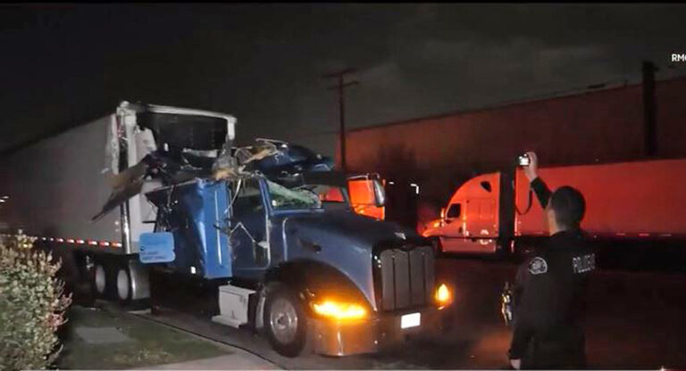 SANTA FE SPRINGS, Calif. — A Mazda passenger car careened into the top of a semi cab Thursday night near Los Angeles after its driver left the roadway, sped through a dry river bed, then launched out of it.