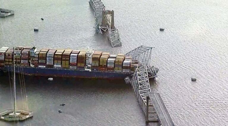 Cartwright said that some cargo appeared to be dangling from the bridge, which spans the Patapsco River at the entrance to a busy harbor. The river leads to the Port of Baltimore, a major hub for shipping on the East Coast. Opened in 1977, the bridge is named for the writer of “The Star-Spangled Banner.”