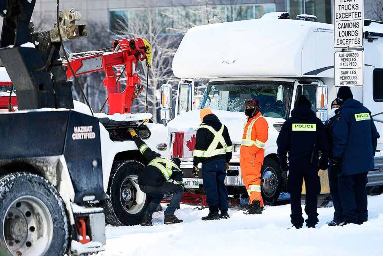The emergency act also enabled law enforcement authorities to compel tow truck companies to assist. Ottawa police said earlier that they couldn’t find tow truck drivers willing to help because they either sympathized with the movement or feared retaliation.