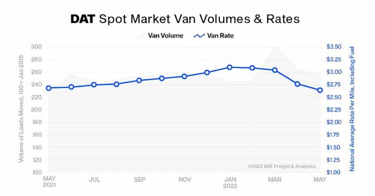 DENVER — Truckload freight volumes declined for the third straight month in May, and the average rate to move dry van freight on the spot market dipped below $2 per mile, excluding fuel surcharges, for the first time since July 2020, according DAT Freight & Analytics, operators of the industry’s largest truckload freight marketplace and DAT iQ data analytics service.