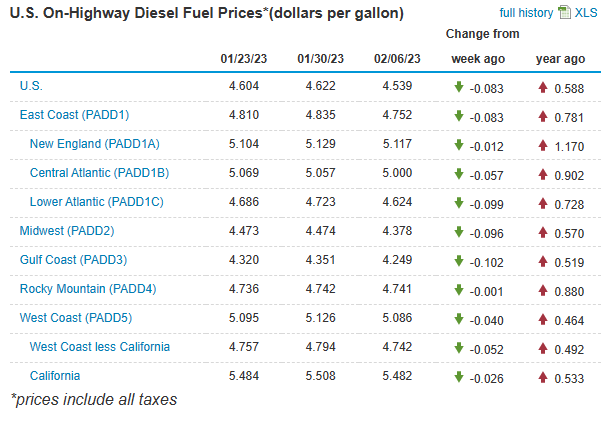 LITTLE ROCK, Ark. — The average price for a gallon of diesel fuel fell to $4.539 as of Feb. 6, down from $4.622 on Jan. 31 and $4.604 on Jan. 23, according to the Energy Information Administration (EIA).