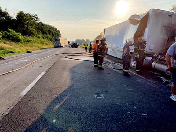 The July 9 accident, which occurred about 5 p.m. on Interstate 70 near Cambridge, Indiana, involved two tractor-trailers and a Chevrolet passenger vehicle. When Wayne County Deputies arrived at the scene, they found a Chevrolet car and a 2004 Kenworth tractor with a loaded box trailer off the left side of eastbound I-70, both fully engulfed in flames.