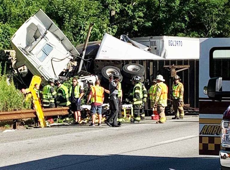 “RFC arrived on location in the southbound lanes with a vehicle on its side,” Radnor Fire Company posted to its Facebook page. “The crew further reported that a tractor trailer had gone through the guardrail from the southbound lanes and collided with a tractor trailer in the northbound lanes. Subsequently, the tractor trailers blocked all three northbound lanes.”