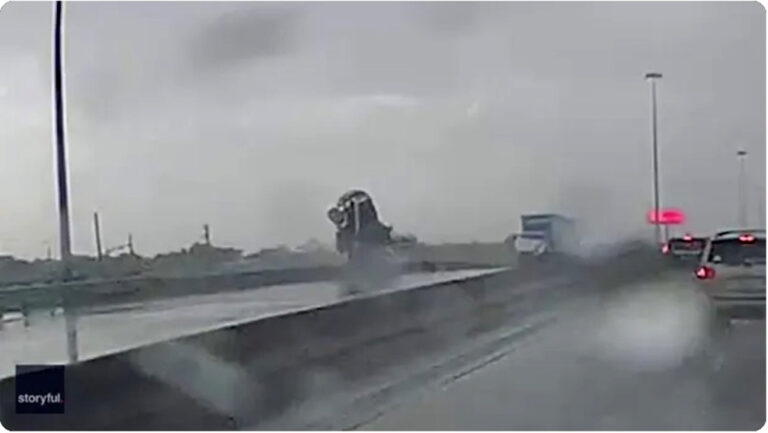 Dash cam video captured by a passing motorist shows what appears to be the truck’s driver escaping before the tractor trailer fell off the edge of the highway.