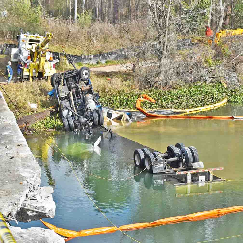 An oily sheen on the water’s surface surrounded the wreckage Tuesday. Authorities have not said what caused the wreck. The driver was not identified.
