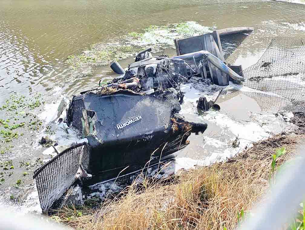BOYNTON BEACH, Fla. — A truck driver is in serious condition at a Florida trauma center Wednesday morning after his Kenworth tractor-trailer caught fire and wrecked on its side in a canal along the Florida Turnpike.