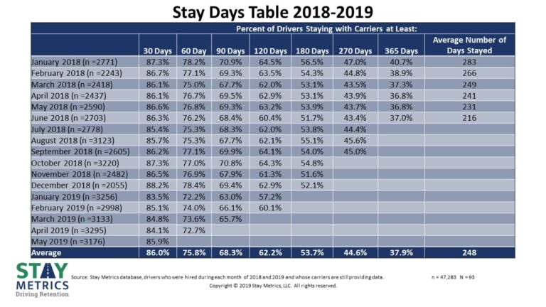 SOUTH BEND, Ind. — Stay Metrics, a provider of driver retention tools, has updated its Stay Days Table for the first half of 2019.