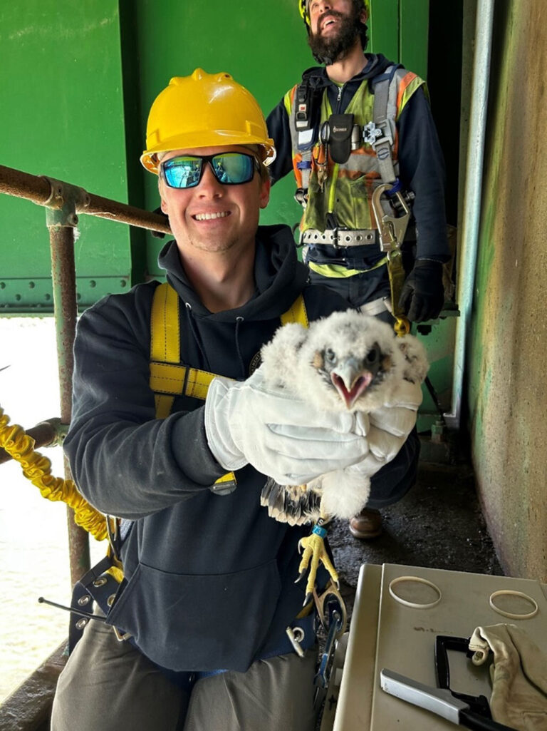 Along with their leg bands, the peregrine falcon chicks were also given names. The International Bridge staff named the female chicks Janet and Barb and the male chick Chum.