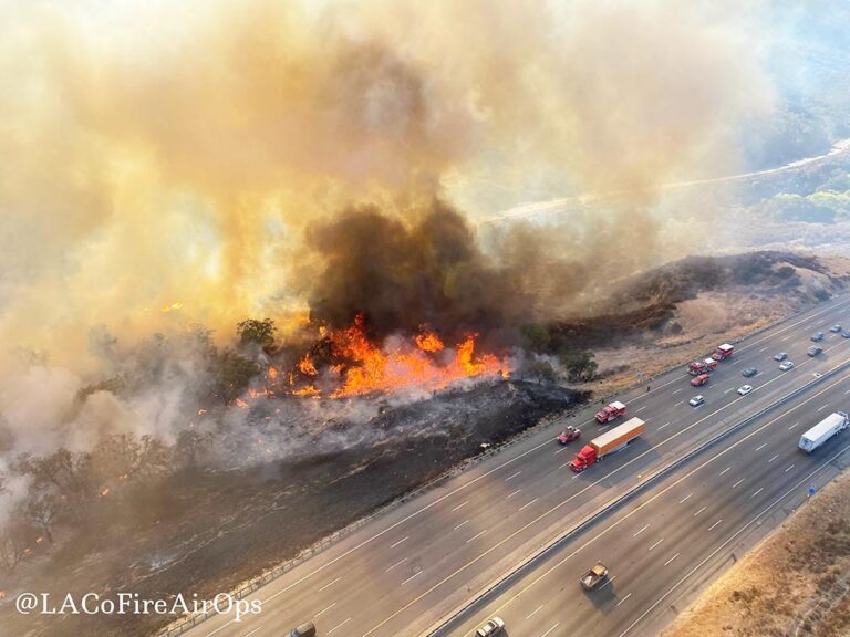 The California Highway Patrol (CHP) closed a stretch of Interstate 5 for several hours as air tankers dropped bright-orange retardant on the flames. A large flareup sent heavy smoke drifting toward freeway lanes Sunday afternoon, the CHP reported.