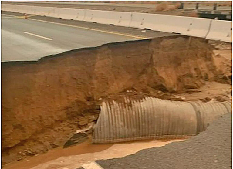The Interstate 10 washout occurred near the community of Desert Center in Riverside County, about 165 miles east of Los Angeles. Westbound lanes carrying traffic out of Arizona were open.