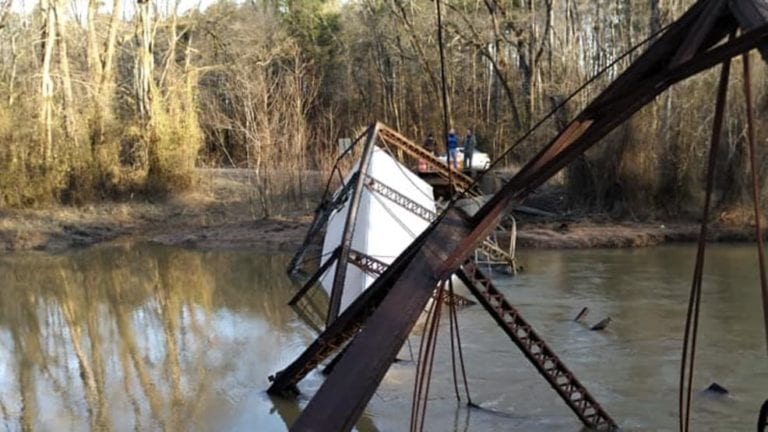 Photos show the bridge collapsed under the weight of the truck, tilting the vehicle on its side as it hit the water, the county sheriff’s office said. Gilkey said the driver was “a little shaken up” but wasn’t injured and managed to escape.