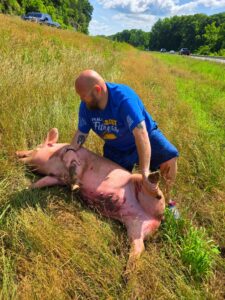 “After Deputies Broom and Carver tried for about an hour to get the pig “wrangled” without success, off duty Deputy Payne was driving by when he saw the event unfolding,” the DCSO said. “Deputy Payne exited his vehicle, went straight to the median, swept that big beautiful girl off her feet, and got her tied up with some assistance from Deputy Carver.”