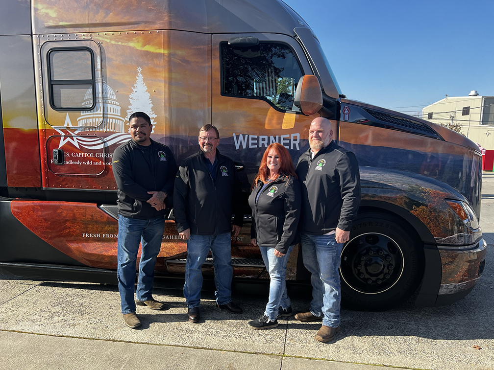 For Werner Enterprises drivers Jesus Davila, from left, Tim Dean, and Gina and Steve Jones, transporting the 2023 U.S. Capitol Christmas Tree from the Monongahela National Forest in West Virgina to Washington, D.C. (Photo by James Edward Mills)