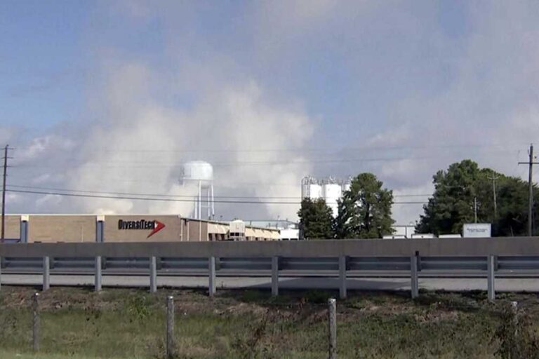 A small fire on the plant’s roof was initially contained, but reignited Sunday afternoon, Sheriff Eric Levett said in a video posted on Facebook as gray smoke spewed into the sky behind him. He said authorities were trying to get the fire under control and urged people to stay away from the area.