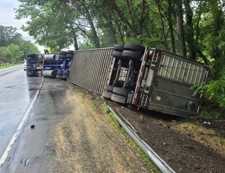 ISP said in its media release that the tractor-trailer rolled onto its side as it attempted to make the curve.