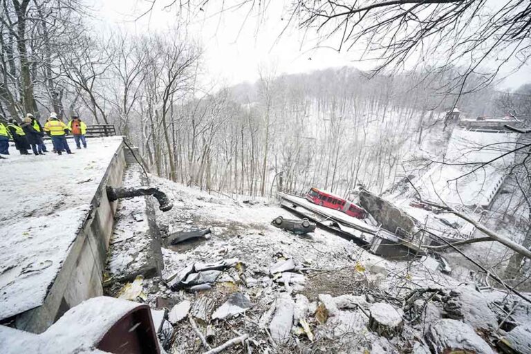 PITTSBURGH — Federal investigators have vowed to put a collapsed bridge in a Pittsburgh park “under a microscope” as they examine evidence, including video from a municipal bus that plummeted along the span, prompting rescuers to rappel down a ravine and form a human chain to reach a few occupants.
