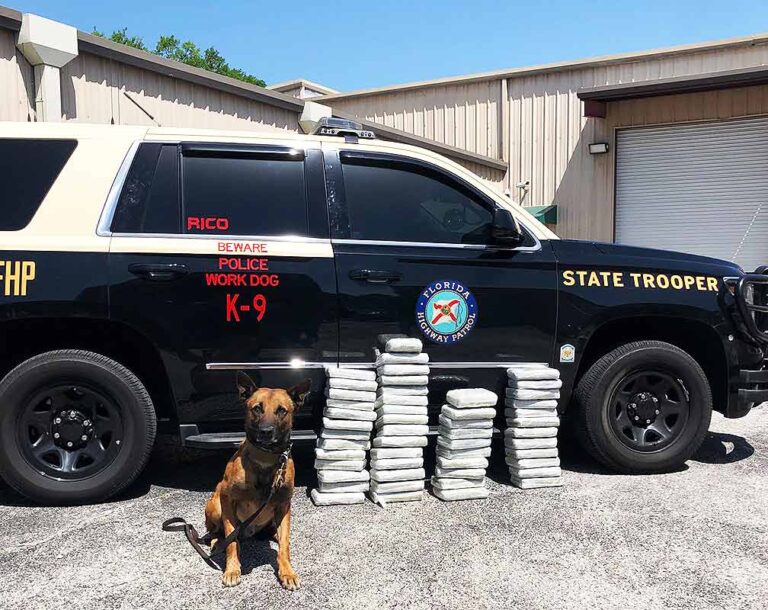 A tweet by the Florida Highway Patrol in Orlando said that K-9 Rico and Orlando Criminal Interdiction Unit team assisted U.S. Drug Enforcement Agency in tracking down and finding 50 kilos of cocaine in a tractor-trailer unit.