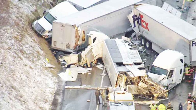 The FedEx truck plowed into a bus headed from the New York area to Cincinnati around 3:30 a.m. on Jan. 5, 2020. The lawsuit says one of the plaintiffs, a child identified by his initials, was decapitated in the crash.