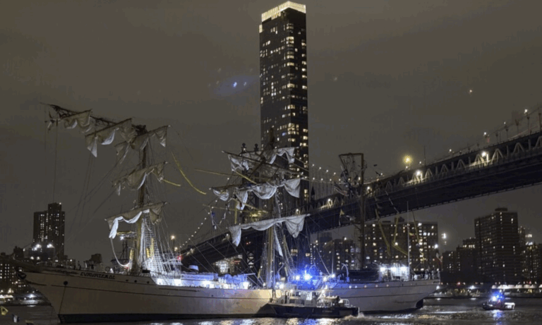 NEW YORK (AP) — A Mexican navy sailing ship on a global goodwill tour struck the Brooklyn Bridge in New York on Saturday, snapping its three masts, killing two crew members and leaving some sailors dangling from harnesses high in the air waiting for help.