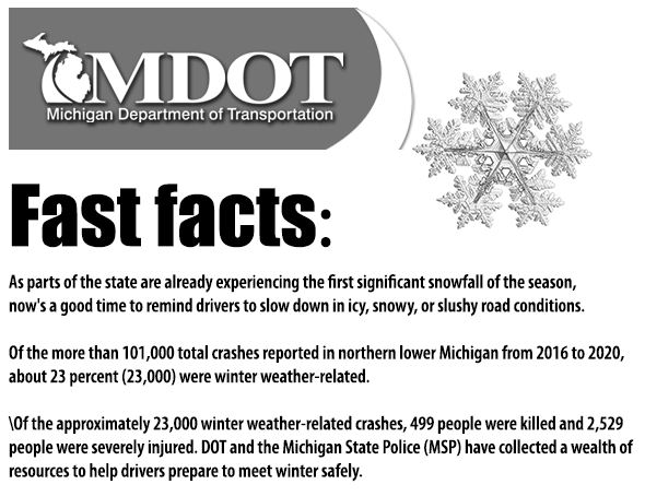 LANSING — As northern lower Michigan receives the first significant snowfall of the season, and with the Thanksgiving holiday just around the corner, the Michigan Department of Transportation (MDOT) is reminding drivers to slow down and be cautious on wintry roadways.