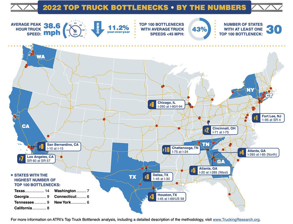 The bottleneck locations detailed in this latest ATRI list represent the top 100 congested locations, although ATRI continuously monitors more than 300 freight-critical locations.