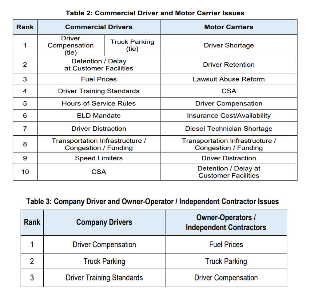 Nearly 25 percent of the survey respondents were professional truck drivers. Among their top concerns were driver compensation and truck parking, which tied for the number one industry concern. Detention and delay at customer facilities was ranked by drivers as their second most pressing concern among drivers.