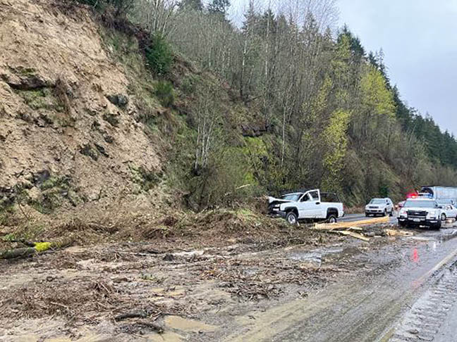 Photos posted on Twitter by Finn appeared to show a pickup truck’s front end damaged and caught in the slide. Tree branches, mud and other debris appeared to have slid down from a hill. No injuries were reported.