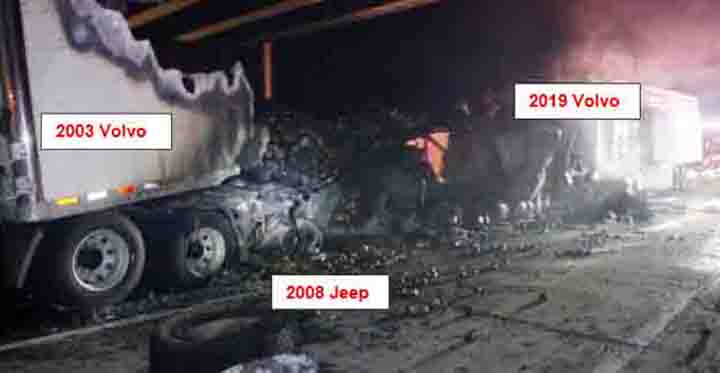 Debris from the collision also damaged a 2010 Ford Focus. The vehicles came to rest on I-84 under the Cloverdale overpass. A post-crash fire consumed the Jeep and the 2003 and 2019 Volvo combination vehicles. The fire also damaged other vehicles and the Cloverdale overpass.