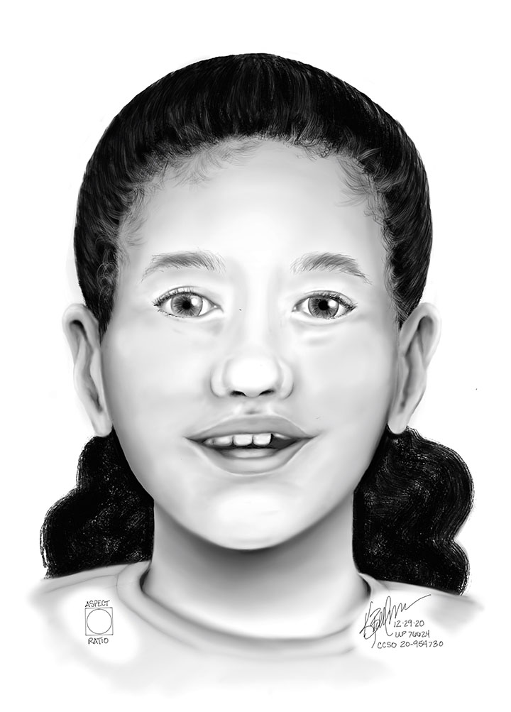 The Oregon State Medical Examiner’s Office estimates the deceased’s age to be 6.5 to 10 years old. She was between 3 feet, 10 inches and 4 feet, 6 inches tall and had long hair that is dark brown or black. Her race or ethnic origin has not determined; but DNA analysis is not complete. Officials estimate the child had been dead for at least 30 days before the body was discovered. The above sketch was compiled by the Clackamas County Sheriff’s Office.