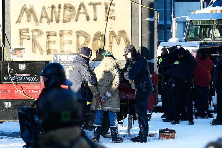 The crackdown on the self-styled Freedom Convoy began in the morning, when hundreds of police, some in riot gear and some carrying automatic weapons, descended into the protest zone and began leading demonstrators away in handcuffs through the snowy streets as holdout truckers blared their horns.