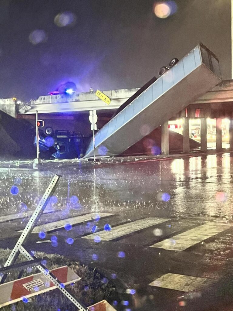Police said the tractor was traveling northbound when it left the roadway and struck the guardrail; the 18-wheeler went partially over the guardrail, leaving it hanging from the overpass.