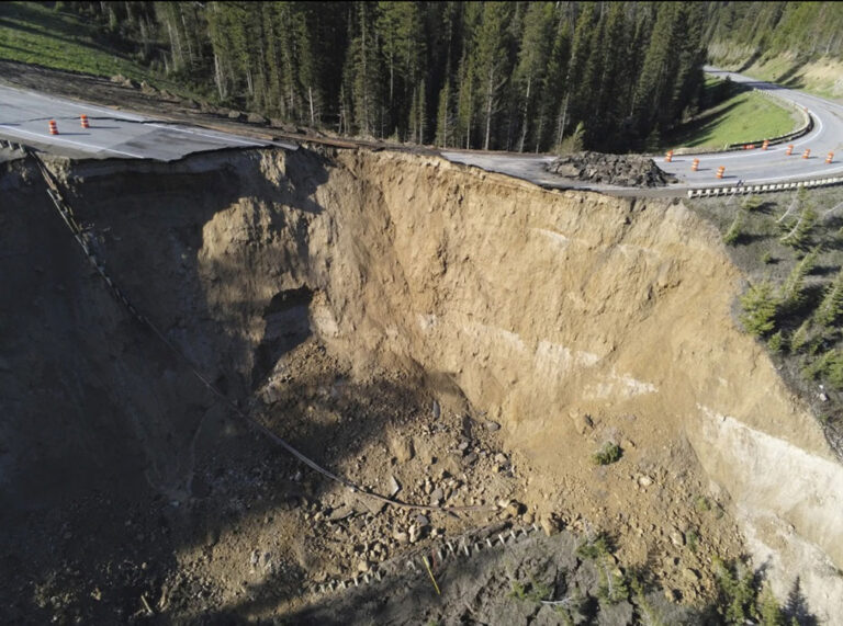 Aerial photos and drone video of the collapse show the Teton Pass road riven with deep cracks, and a significant section of the pavement disappeared altogether. Part of the guardrail dangled into the void, and orange traffic drums marked off the danger area. The road was closed at the time of the collapse.