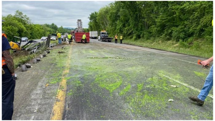AUQUIER COUNTY, Va. — Thousands of green peas were scattered along westbound Interstate 66 on Saturday, May 18, after a tractor-trailer hauling the little green balls collided with a guardrail and overturned in Fauquier County, Virginia, according to the Virginia State Police (VSP).