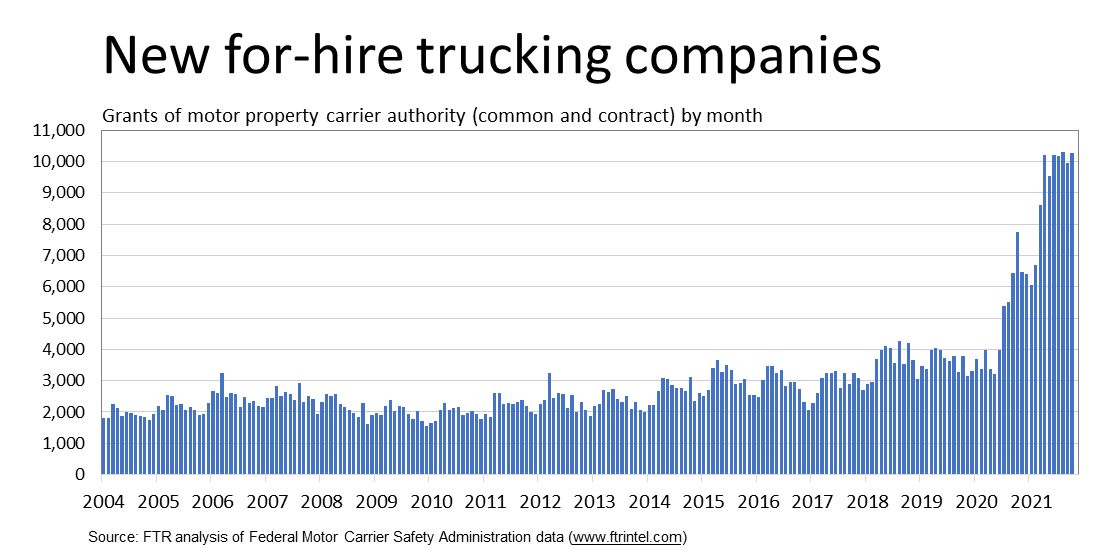 Through October, FMCSA has already authorized more than 92,000 new for-hire trucking firms in 2021. On the strength of the second half of the year, that figure in 2020 was about 59,000. Before that, the most new carriers authorized in a single year had been just under 44,000 in 2018, according to Vise.