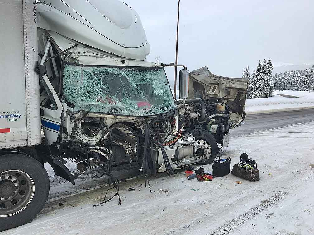 A cab of one of the semis involved in the wreck was twisted 90 degrees. All westbound lanes were blocked for several hours.