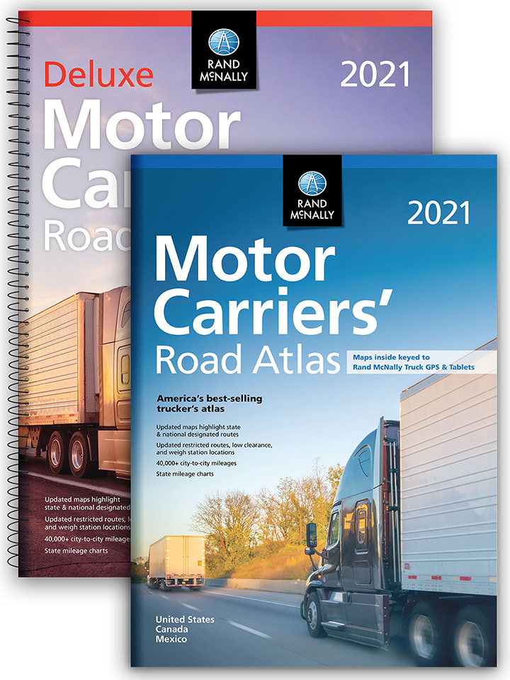 The 2021 edition of the atlas — featuring fully updated truck-accessible roads, state trucking regulations and fuel tax charts — is available in paperback as well as a version with laminated pages and a stay-flat spiral binding; there is also a large-print edition with maps that are 37% larger.