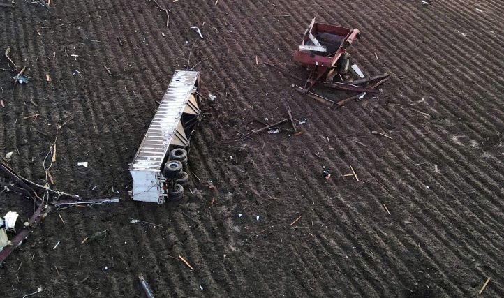 Outside, the tornado had turned the farm’s 103-year-old barn to rubble and strewn debris across the fields for hundreds of yards. He said Friday morning that he found one his cows dead in the barn and 10 more were missing.