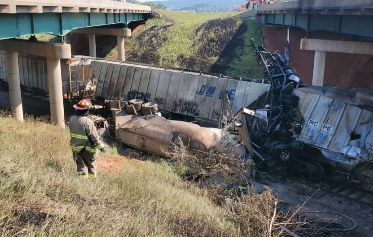 The rig’s impact after crashing over the bridge caused two train cars to derail.