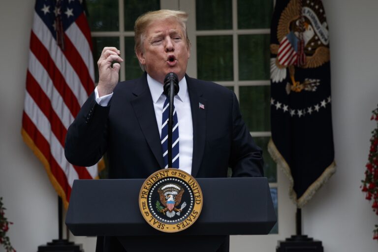 He met briefly with Pelosi and Senate Minority Leader Chuck Schumer and other Democrats before exiting to address reporters in the Rose Garden.