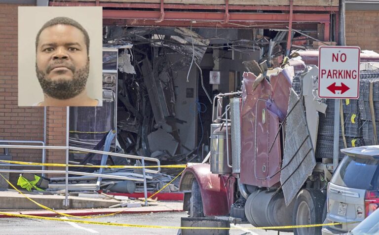 The intentional crash into the single-story brick building off a highway in Brenham, a rural town outside of Houston, littered debris in the parking lot and left a gaping hole in the entrance. The crash damaged the front of the red semitrailer, which was hauling materials on a flatbed.