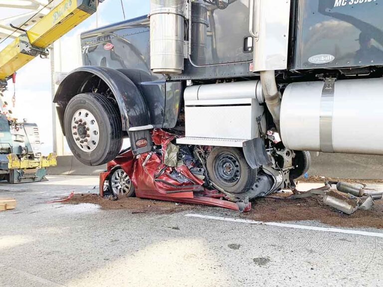 MOUNT VERNON, Wash. — A Peterbilt traveling along the Interstate 5 Skagit River Bridge in Washington State Tuesday crashed into the rear end of a passenger car, folding the car’s back end into its roof, then driving over the rest of it.