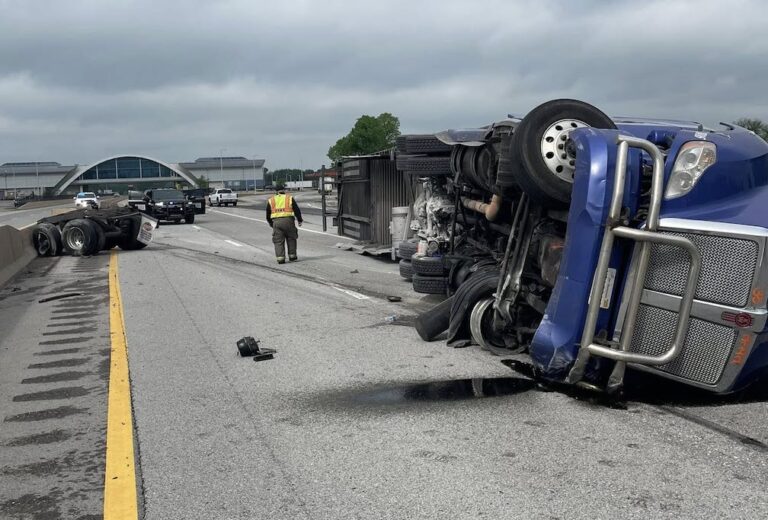 VINTA, Okla. — A semi truck overturned on Interstate 44 inside the Will Rogers Turnpike near mile marker 289 near Vinta.