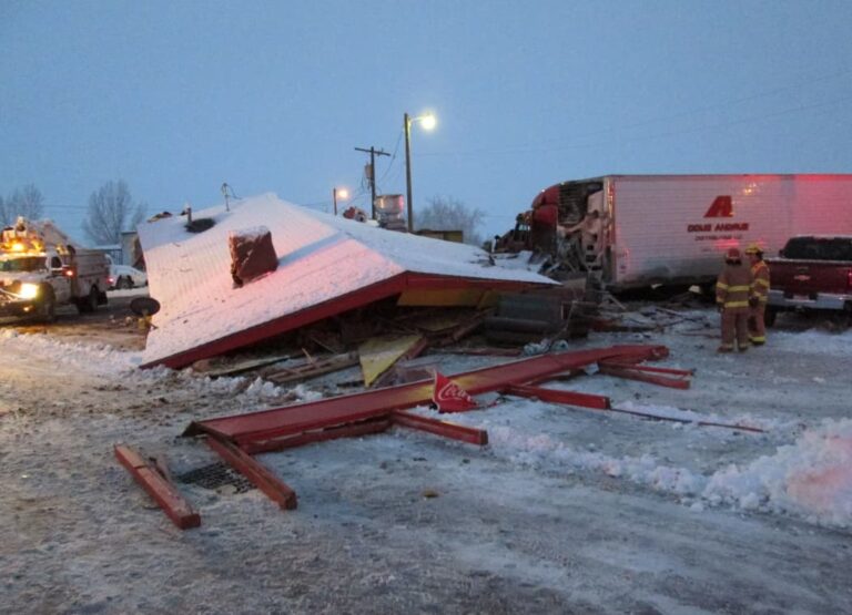 Images of the wreck showed the restaurant’s snow-covered roof torn off and leaning on top of the collapsed restaurant, the semi-trailer’s cab lodged into a corner of the building and the trailer jack-knifed. The restaurant is just off the highway, State Route 6.