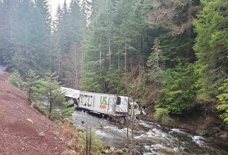 RURAL OREGON — A US Foods truck hauling tandem trailers ended up in the middle of the Santiam River in Oregon on Monday after leaving Highway 22 near milepost 71.