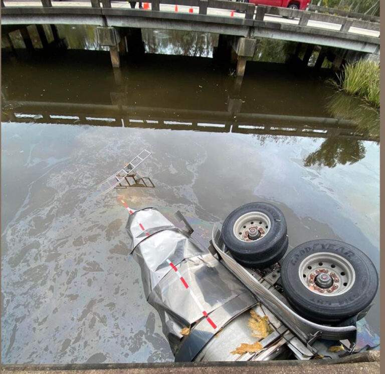 RURAL LOUSIANA — A tanker truck driver was hospitalized on Nov. 22 after his rig wound up in the water below Interstate 10 at the line between St. James and Ascension parishes in Louisiana.