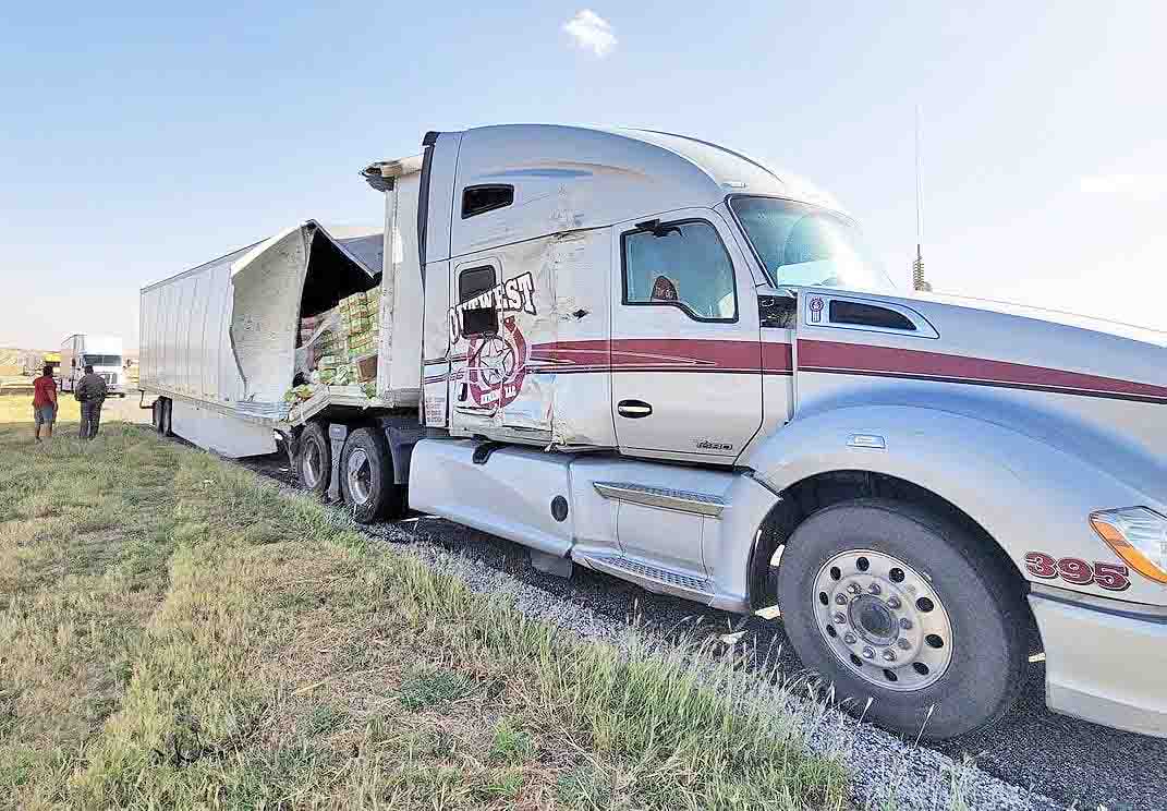 The right sleeper of the Kenworth tractor was dented and scraped, but the trailer took the brunt of the damage, ripping open to expose its cargo of dry goods.