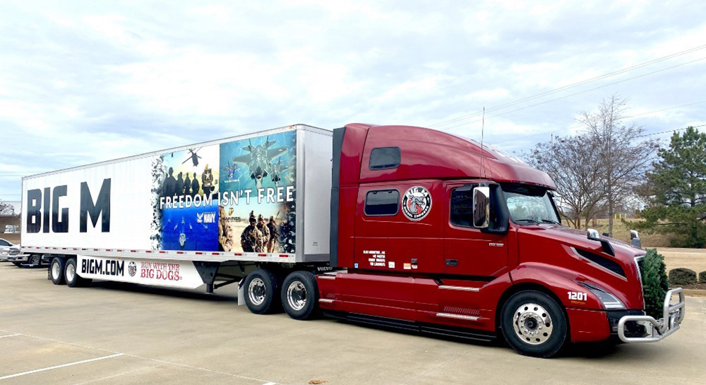Big M Transportation, based in Mississippi, shows its respect and appreciation for veterans and military service members through inviting veterans to join the Big Dog Fleet for the Elite VA Program; offering a two-year paid benefit through a partnership with the Mississippi VA, and participating in a Nationwide Under 21 program, which provides veterans under the age of 21 with truck driving experience through a new pilot program sponsored by the U.S. government. Big M thanks the nation’s military members with the message “Freedom isn’t free.”