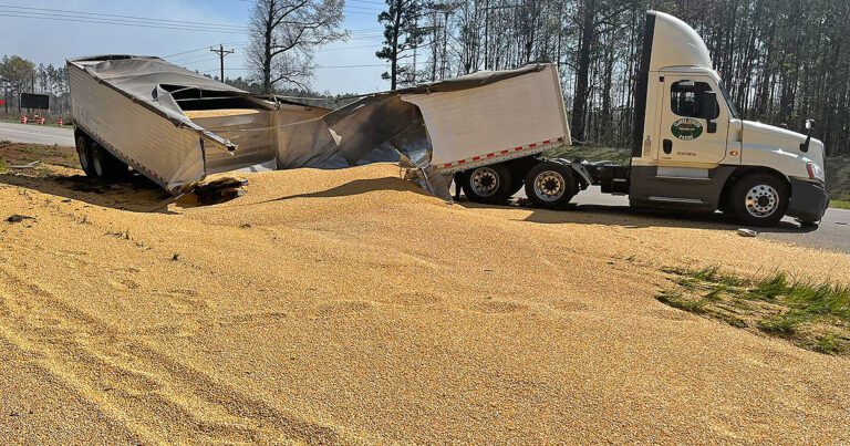 WGXA reported that the grain spilled across three lanes and onto the median of Fall Line Freeway at Suburban Drive in Washington County, Georgia.